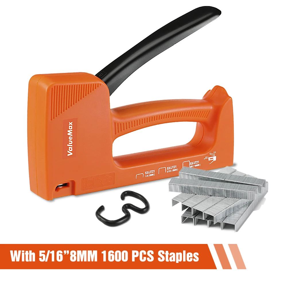 Product Information Features: ValueMax 3-in-1 manual nail gun will be more practical and versatile with D-type, U-type and brad nails, which is perfect for various stapling purposes like upholstery, crafting and other decorative tasks. 1、Safe Design - The stapler with a handle lock will ensure safe storage and avoid child accidental injury. Please make sure that it is unloaded, hold handle down and engage handle lock. 2、Convenient Loading Magazine - Just press the release latch and load rod, the staple gun can help you to finish the work; strength setting knob makes the adjustment of staple depth easier. 3、The tail of the product has a nail remover function. Notice: There are a total of 2000 staples of both U-Type, and Brad nails in one small box, and another 1000 Door Type staples in the other small box. COMPATIBILITY: Door-Type Staples: 6-14mm(1/4"-9/16") U-Type Staples: 10-12mm(3/8"-1/2") T-Type Staples: 15mm(19/32") PACKAGE INCLUDES: 1 x Staple Gun 1000 x Door-type Staples 1000 x T-type Staples 1000 x U-type Staples ValueMax Type53 Nail Gun with 1600 Nails Prooduct Size :480*27*90mm JT21 Nail Size:0.7*11.3*8mm PACKAGE INCLUDES: 1 x Staple Gun JT21 Nail :1600PCS 3-in-1 manual nail gun Type53 1600nails