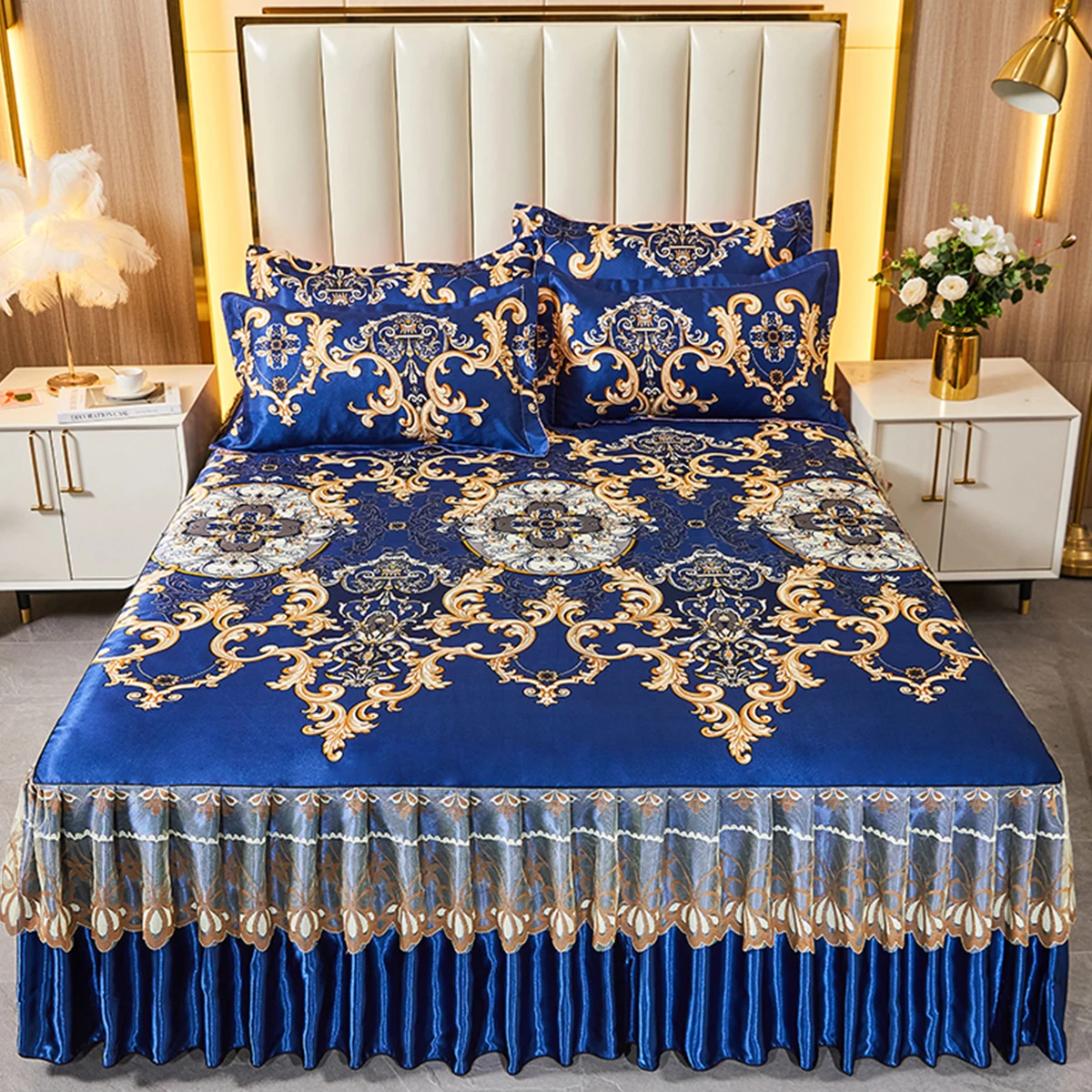 3 Pieces Blue Mattress Pad Sheet Set Paisley Blue Rufled Quilted FittedMattress Protector Include Bed Skirt with 2 Pillowcases