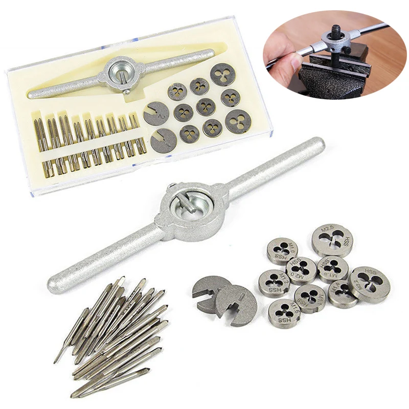 31pcs Metric Tap And Die Set M1-M2 Metric Screw Thread Plug Hand Screw Taps Straight Taper Tapping and Thread Tools Wrench Set Descriptions: Type: Tap And Die Set Material: High Speed Steel Professional device for commercial or occasional use High speed steel (HSS) is the finest materials for tap and dies Perfect for model making / watchmaking or small engineering paintings Tap and die set product of superb HSS material make certain splendid service lifestyles and durability Multi-purpose: Tap and die set is perfect for repairing and making a big selection of threads and excellent for working in tightly confined places Easy to carry, it can be operated freely in a small area Package Included: 9pcs Die: M1 M1 M1 M1 M1 M1 M2 M2 M2( Each length one piece) 9pcs Tap: M1 M1 M1 M1 M1 M1 M2 M2 M2(Each size two pieces) 1pc Wrench 2pcs Tap holder