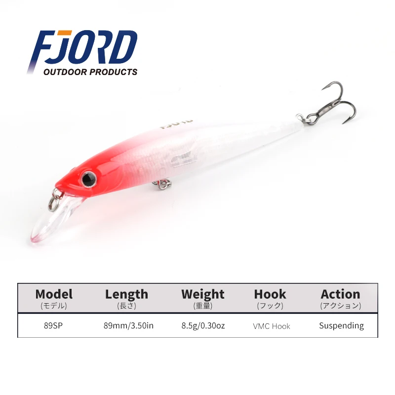 Product Features: Carefully designed chamber host steel bearings for unique sound resonance Sharp hooks make sure fish cannot escape Smooth fish paint, real looking fish eyes are extra appealing to fish Product Details: Lure Brand: FJORD Lure Model:Minnow 89SP Lure Type:Minnow lure Lure Weight: 8 Lure Length: 89mm Hooks: Strong VMC Hooks Rings: Quality Split Rings Colors: 10 colors would be choose Action:Suspending Packing: Package Weight: 20g Package Including: 1pcs* Fishing Lure