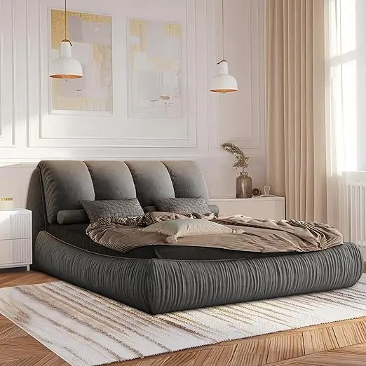 Sobre este artículo Marco de cama King: esta cama de plataforma tapizada de lujo cuenta con un marco de madera maciza, proporcionando un soporte y durabilidad excepcionales Las dimensiones de tamaño King de 86 pulgadas de ancho x ninety six pulgadas de profundidad x 43 pulgadas de alto garantizan un amplio espacio para una noche de sueño cómoda Cabecero tapizado elegante: el respaldo acolchado de gran tamaño añade un toque de lujo a este marco de cama La cabecera totalmente tapizada no solo es estéticamente agradable, sino que también proporciona mayor comodidad y apoyo Construcción de madera maciza: hecho de madera de pino de alta calidad, este marco de cama está construido para durar La construcción de madera maciza garantiza estabilidad y longevidad, por lo que es una opción confiable durante años Compatibilidad versátil del colchón: esta cama de plataforma está diseñada para acomodar múltiples alturas de colchones Ya sea que prefieras un colchón de 6, 8, 10 o 12 pulgadas, este marco de cama es adecuado para tus necesidades específicas Fácil montaje y tapicería extraíble: el montaje es muy fácil con las herramientas incluidas, como un martillo La tapicería también es extraíble, lo que permite una fácil limpieza y mantenimiento Transforma tu dormitorio en un refugio acogedor con el marco de cama Cloud