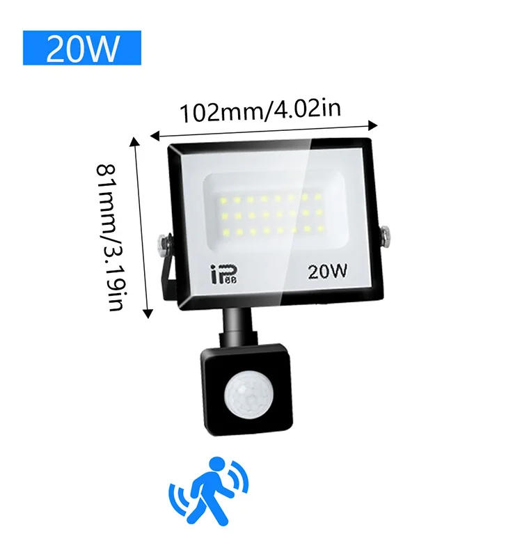 IP66 LED Floodlight Motion Sensor 20W 30W 50W 70W 100W 150W 200W 300W Waterproof Outdoor Projector Exterior Spotlight For Garden Street Garage LightingSpecifications: Power: 20W/30W/50W/70W/100W/150W/200W/300WVoltage: AC220V(175-265V)/110V(100-130V)Waterproof: IP66(can no longer put into water)Material: Die-casting Aluminum illuminationAngle (degrees): a hundred and twenty degreeUsage:Our Led spotlight can be utilized on roads, gardens, bridges, billboards, streets, parks, trees, hotels, residential decoration and much more!【Sensitive and Waterproof PIR Motion Sensor】 - Security Lights is an out of doors movement activated safety lamp, correct for garden, garage or shed. The Security Lights activated robotically through any motion detected inside 5-10 of the sensor. The sensor lighting fixtures operate three modes: TIME, SENS and LUX – with customisable settings for light duration, motion sensitivity and lighting fixtures strength