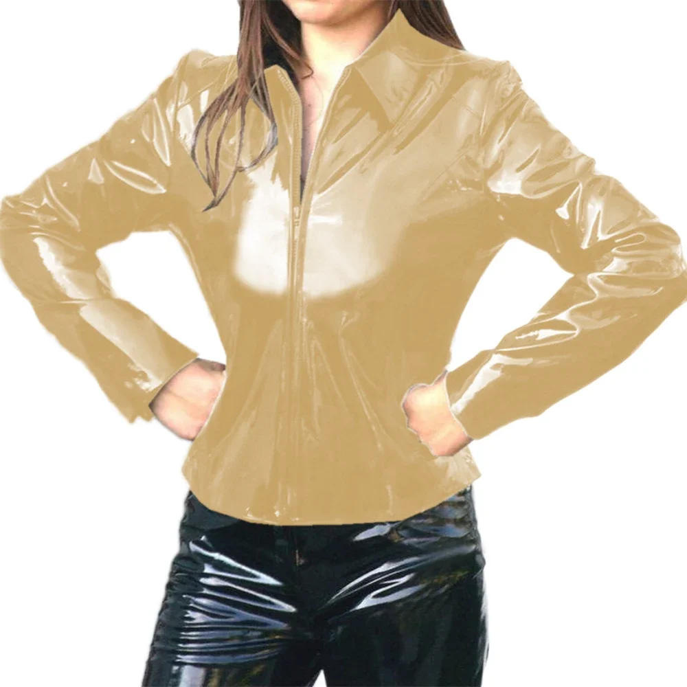 Long Sleeve Zipper Turn-down Collar Shiny PVC Leather Womens Jackets High Streetwear Latex Look Coats Gothic Nightclub Top Coat