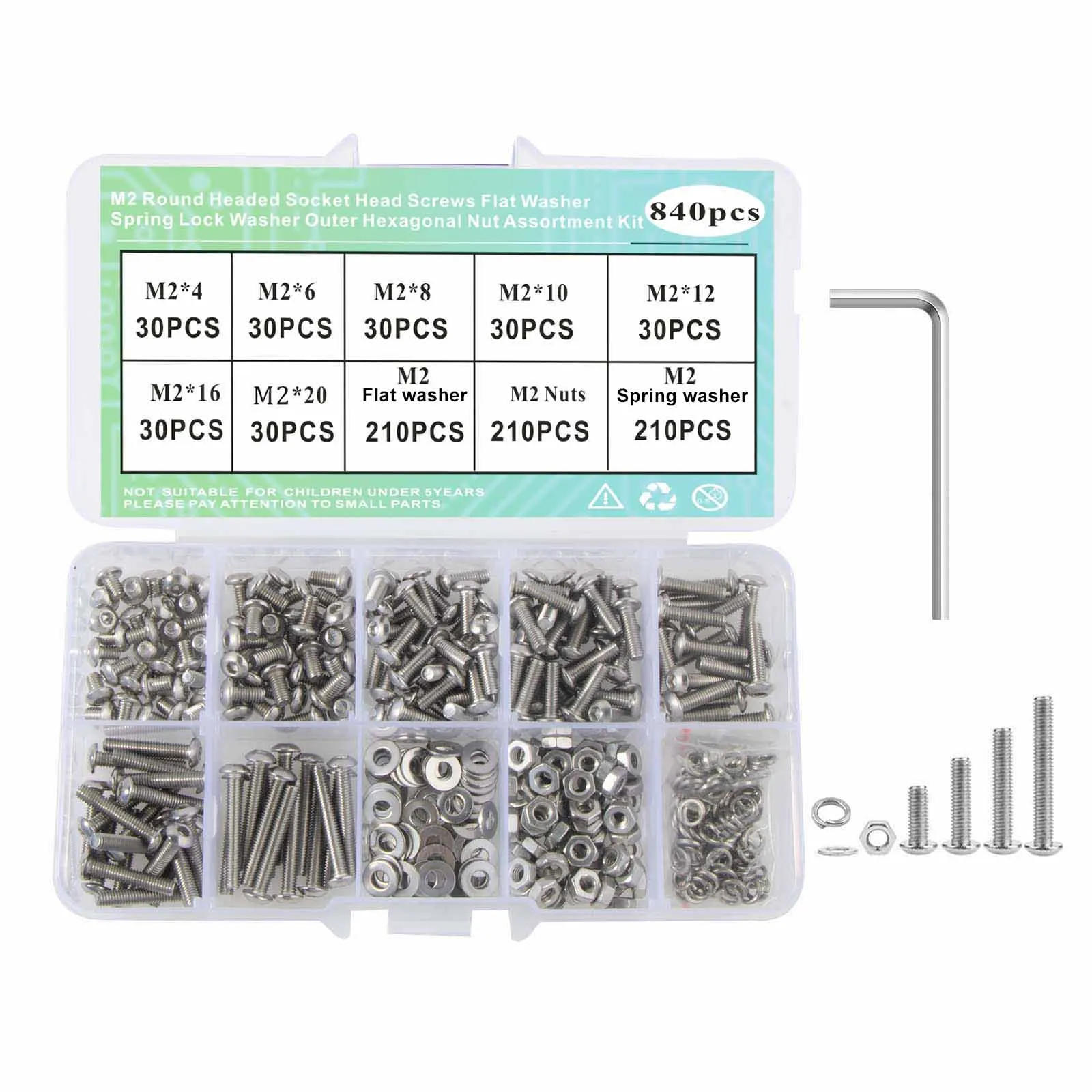 M2 M3 M4 M5 304 Stainless Steel Round Headed Socket Head Bolts Assortment Kit,Bolts Flat Washers Nuts Set With Hex Wrenches 840/560/330/810/1100Pcs.【Sizes】-M2 x 4mm/6mm/8mm/10mm/12mm/16mm/20 mm, M3 x 6mm/8mm/10mm/12mm/16mm/20mm/25mm, M4 x 6mm/8mm/10mm/12mm/16mm/20mm/25mm, M5 x 8mm/12mm/16mm/20 mm, screws with matching hex nuts and flat washers Spring washer Hex Wrenches, assorted sizes can meet your various needs.【304 Stainless Steel】-stainless metallic materials that have nice corrosion resistance in dangerous environment like excessive temperature, cold weather, and high humidity areas. They have advanced rust resistance and perfect oxidation resistance, which might ensure long time using.【Package】-M2-840Pcs,M3-560Pcs,M4-330Pcs,M2 M3 M4 Kit-810Pcs,M2 M3 M4 M5 Kit-1100Pcs in total, packed in durable clear box with label. It is easy to distinguish the size of the product, when you want to use a certain screw, you don't need to waste time purchasing it separately, you can choose the appropriate one to meet all your needs.【Wide Applications】-Widely used in all types of precision equipment industry, categorised instruments, instruments, electronic products, revealed projects, family appliances, verbal exchange products, locks, lamps, lights, toys, etc.【Tips】-Products involve small parts, hold away from youngsters and prevent inadvertent swallowed. All screws are particular sharp with screw point, please preserve far from kids. Whenever you need us, please unfastened to touch us, we are able to offer you a professional service and respond you within 24 hours.