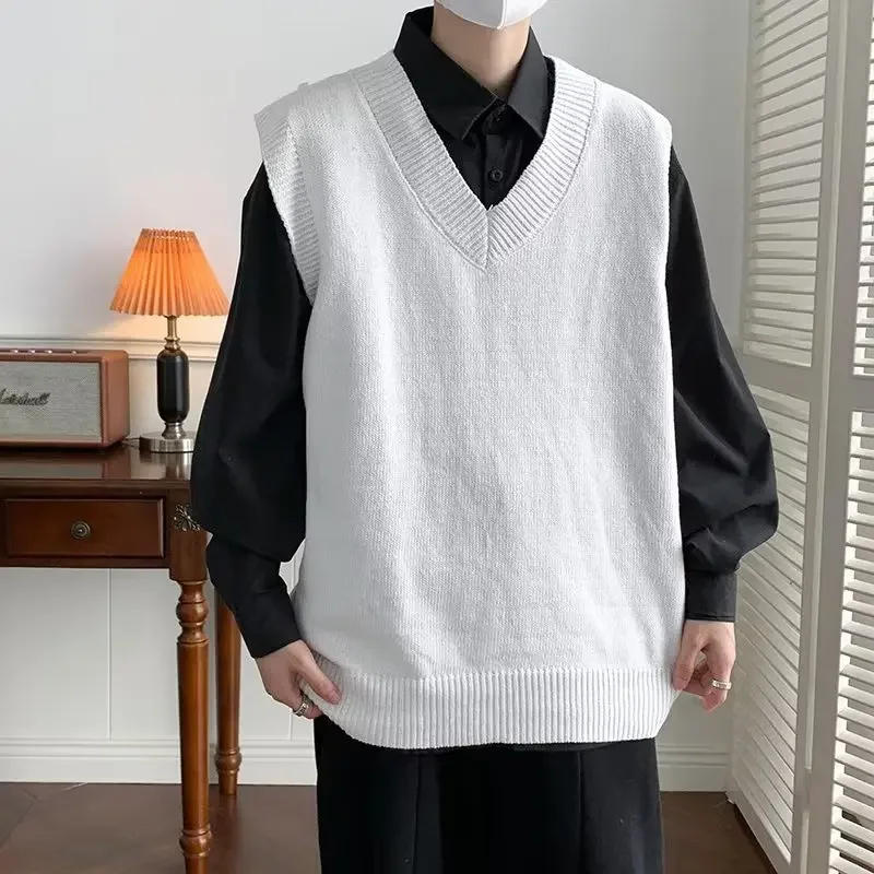 Men's V-neck Knitted Sweater Solid Color Autumn Japanese Style Sleeveless Casual Pullover Youth Trendy Artistic Couple