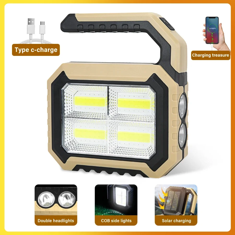 Solar Energy Working Lamp Powerful Flashlight Rechargeable Camping Spotlight with Side Light 5 Lighting Mode for Camping Outdoor
