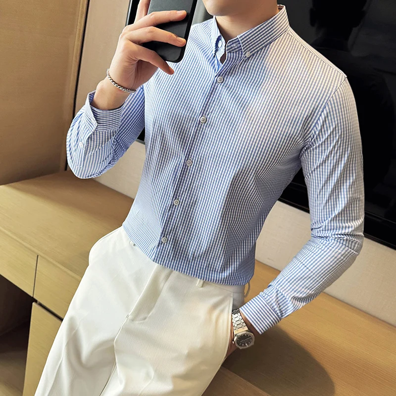 Stripe Shirt for Men Korean Luxury Clothing Long Sleeve Men's Social Shirt Dress Front Pocket Design Slim Fit Casual Prom Tuxedo