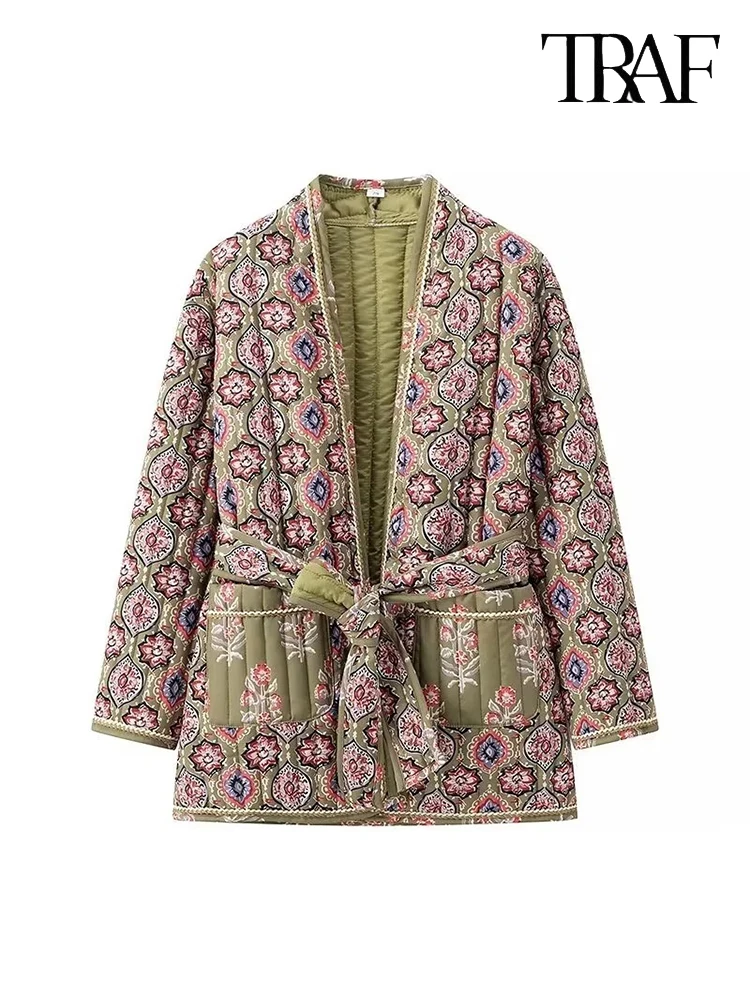 TRAF Women Fashion Ethnic Floral Floral Articulated Belt Jacket Big Pockets Cardigan Cozy Jacket Street Casual Commuter Jacket