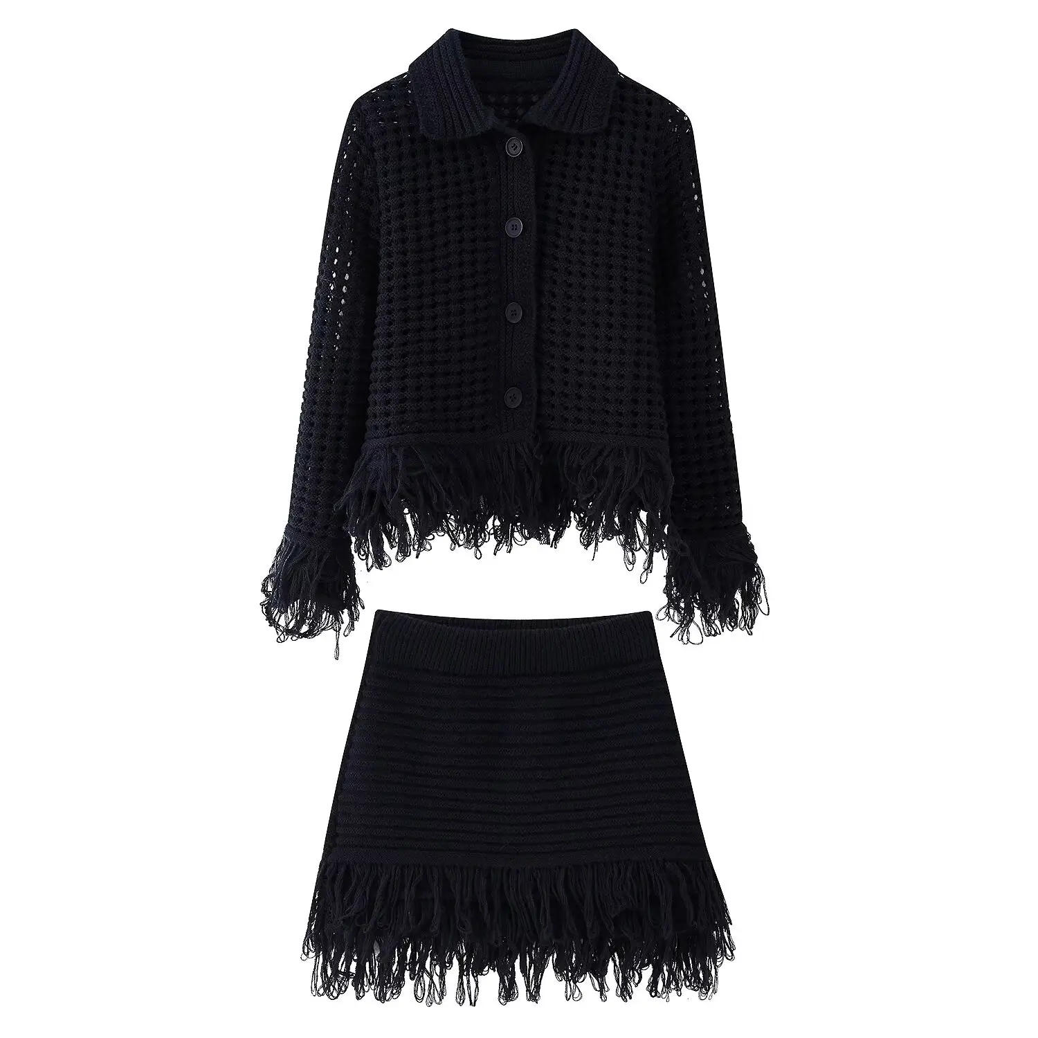 TRAFZA 2025 Women Solid Lapel Button Fringe Decorate Long Sleeve Casual Top+Chic Elastic Waist Mini Skirt Knitted 2 Piece Set