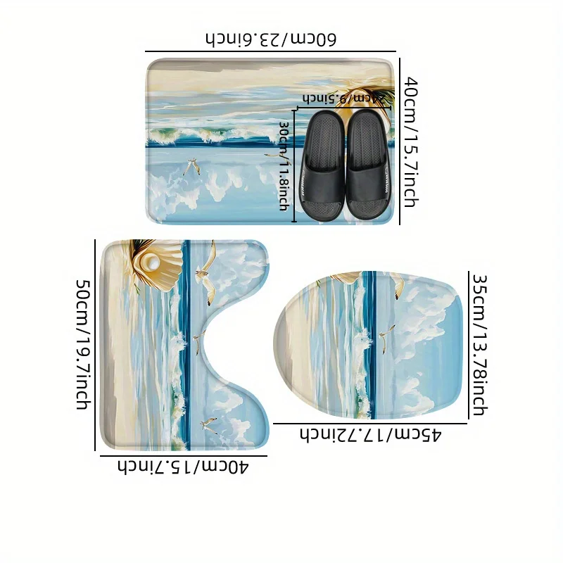 Washable 3-Piece Bathroom Rug Set Non-Slip Ocean Theme Toilet Mat Bathtub Foot Pad Door Mat Flannel Decor with Shell Print