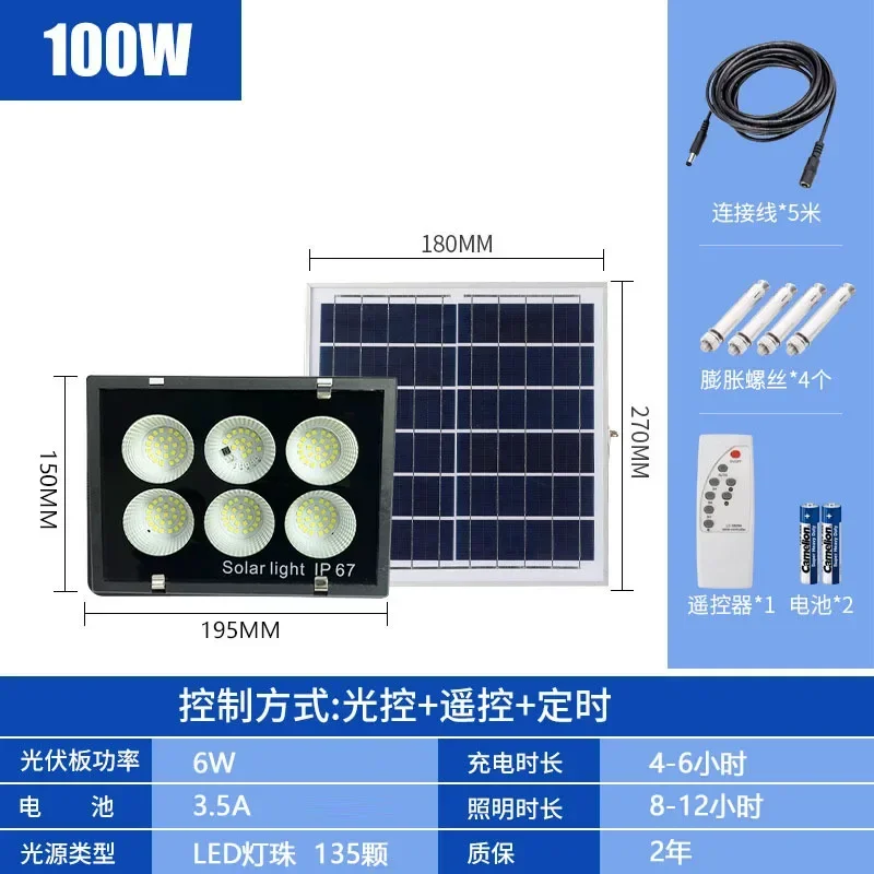 100W/200W 2024 Newest IP67 Remote Control Solar Floodlight for Courtyard Gardengarden Light Lawn Outdoor Lighting Light Control