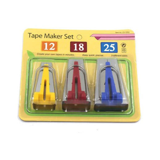 Type:Fabric Bias Tape Makers Material: Plastic, Metal Color: As the picture Tape Makers Size: 6mm (fit for fabric 12mm widths) 12mm (fit for fabric 24mm widths) 18mm (fit for fabric 36mm widths) Size 25mm (fit for fabric 46mm widths