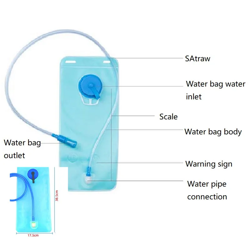 product information Name: 2L Portable Folding Drinking Bag Specifications: 36*17cm Water pipe length: 100cm Material: food-grade transparent TPU, the material has passed the GS test certification. It has good wear resistance and compression resistance. It is recommended to drink at -20C to below 50oC to avoid scalding. Applicable scenes: leisure, mountaineering, beach, outdoor, camping, photography, etc. When strenuous exercise occurs, replenish water in time to prevent water loss. How to use: As long as you bite the suction nozzle to absorb water, a stream of cool and refreshing spring water will immediately flow into your mouth, and it will automatically close after you let go, completely freeing your hands. feature 1. Strong wear resistance. General material are subjected to friction, scratches, etc. during use, which will cause the surface to gradually wear out, while TPU has excellent wear resistance, which is more than 50 times more wear-resistant than natural rubber. 2. Good buckling resistance. Many plastic materials are easy to break under repeated stress, while TPU can maintain excellent buckling resistance under different environments. 3. Hydrolysis resistance TPU has good hydrolysis performance at room temperature, and no obvious hydrolysis will occur within 1-2 years. 4. Tear performance Tear strength is the ability to judge the material's ability to resist tearing, and TPU has a high degree of tear resistance. 5. High temperature resistance and good oxidation resistance. Package includes: Water bag*1