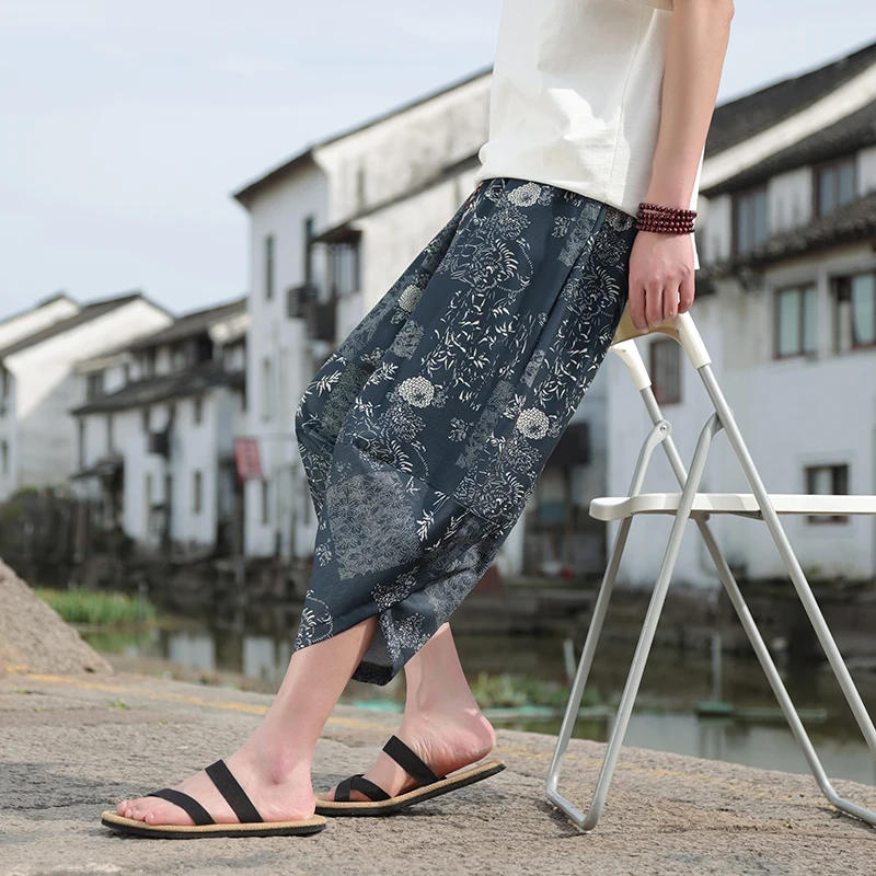 2024 New Men's Chinese Style Summer Thin Beach Pants Large Size Leisure Seven Loose Radish Pants