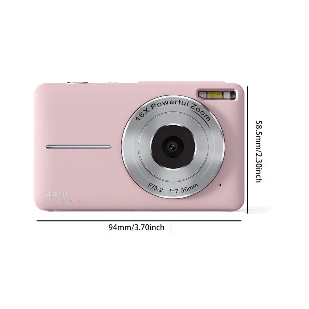 Feature: 1. HD 44MP 1080P and 2.4-inch IPS LCD Screen: This digital camera has up to 44 million pixels, supports 44MP image resolution and 1080p video resolution, providing excellent recording and photography performance. This camera has a 2.4 inch IPS LCD screen, which can capture or play clear quality photos/videos. This mini digital camera is suitable for children/teenagers/elderly/beginners, with face recognition and smiling face detection functions. 2. Camera Timer: This children's digital camera can delay for 2 seconds/5 seconds/10 seconds according to your needs (please press the "left" button). This digital camera has a delay function, which can delay the time and start recording after 2S/5S/10S. 3. Easy to Use and Lightweight: A compact camera designed specifically for children, with just a few buttons and an intuitive interface, it is very easy to use and can also be used well by children. Made of healthy and environmentally friendly materials, it is anti drop and wear-resistant, and can be placed in a bag. And the lanyard can effectively prevent the digital camera from being lost or dropped by children. 4. 16x Digital Zoom and Webcam: This compact camera comes with a 16x digital zoom and built-in flash, allowing you to zoom in or out on images using the W/T button. It can also be used as a web camera. If you connect your camera to your computer through a USB cable, you can make video blog recordings, video calls, or live broadcasts. 5. Perfect Gift for Children: This digital camera is perfect for children. Parents can give them as holiday gifts to their children, allowing them to take photos and record the beautiful daily life. Cameras can also effectively prevent children from becoming to mobile phones, making them perfect for recording happy moments with friends, family, and classmates indoors/outdoors. Specification: Certification: CE Origin: Mainland China Color: Black, Pink, Green (optional) Image sensor: 5 megapixel CMOS sensor (up to 44MP interpolation) Image sensor size: 1/4 inch Pixel: 4400W Photo resolution: 44M: 7600 * 5800: 42M: 7488 * 5616: 36M: 6912 * 5184: 24M: 5600 * 4200: 20M: 5200 * 3900: 16M: 4608 * 3456: 12M: 4000 * 3000: 10M: 3648 2736: 8M: 3264 * 2448: 5M: 2592 * 1944 Video resolution: FDH (1920 * 1080); HD (1280 * 720); 640 (640 * 480) Lens angle: 66 ° Display screen: 2.4 inches, 320 * 240 IPS Lens: F/3.2 f=7.36mm Zoom: 16x zoom Focus: Auto focus File format: photo JPG, video AVI USB: Type-C USB Power supply: 700mAh 3.7V rechargeable lithium battery Working hours: Video recording for approximately 60 minutes Extended memory: Single card slot: TF card slot (maximum 32GB), supporting SDHC/SDXC level 10 or above Language: English, Simplified Chinese, French, Spanish, German, Italian, Portuguese, Dutch language, Japanese, Russian, Arabic Size: 94x58.5x23.5mm/3.70x2.28x0.92inch Weight: 130g Kind reminder: 1. A digital camera compatible with a 4-32GB SD card, please format the SD card before using the camera. This product does not include SD cards for sale Before using the camera for the first time, please fully charge the battery. (Please note that first remove the battery, remove the insulation sticker from the battery, then charge and start using it. Otherwise, the battery will not be able to be used.) 3. When children use digital cameras, please read the user manual carefully. 4. Please ensure that there is an SD card in the camera before use Note: Due to the different monitor and light effect, the actual color of the item might be slightly different from the color showed on the pictures. Thank you! Please allow 1-2cm measuring deviation due to manual measurement. 1 * Camera 1 * Storage bag 1 * Charger 1 * USB cable 1 * Hanging rope 1 * Mirror wiping cloth 1 * Instructions ,