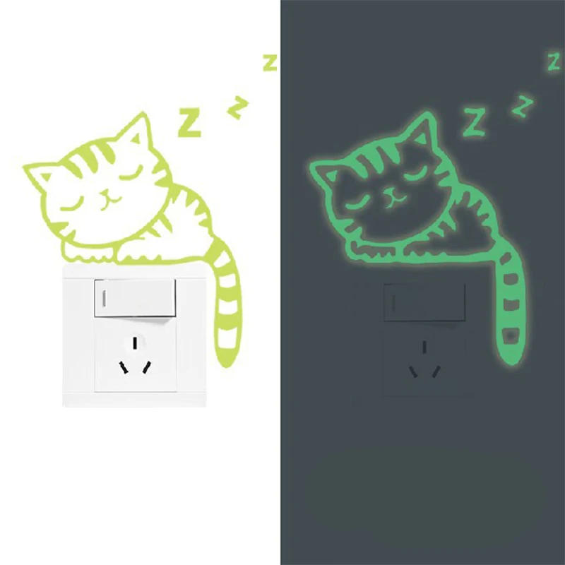 2PCS Luminous Light Switch Decals Glow in The Dark Sleepy Cat Animal Pattern Wall Stickers Light Switch Decor Art Mural Paste