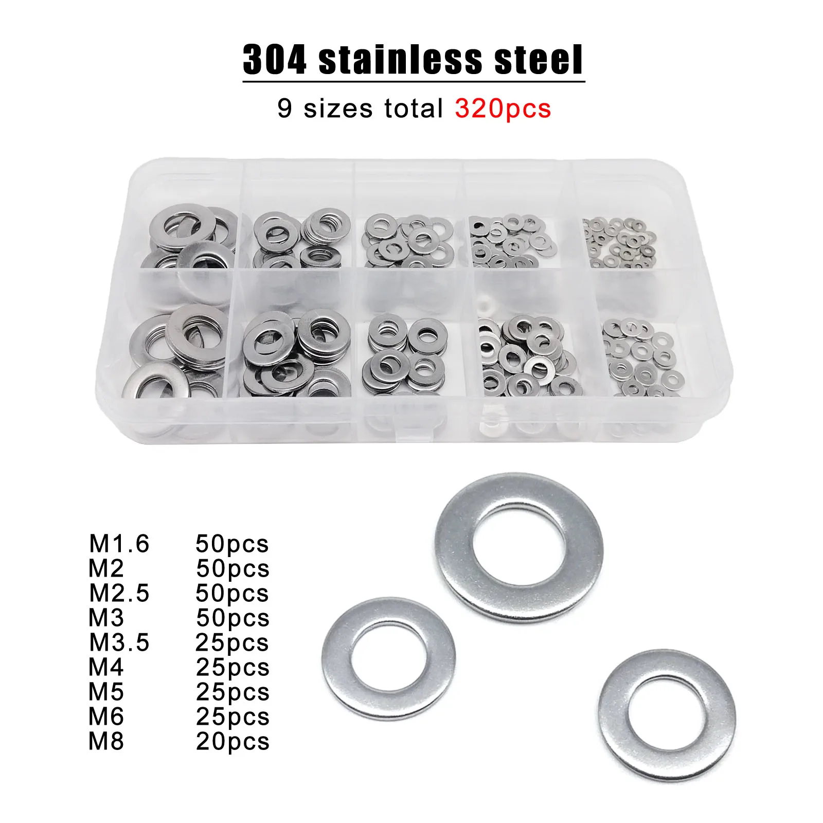 Features• Large Variety of Sizes: This set entails flat washer in M1.6, M2, M2.5, M3, M3.5, M4, M5, M6 and M8, total nine sizes, providing quite a lot of suggestions for various projects.• Durable Material:Made of 304(A2-70) chrome steel or carbon steel, those flat washers are strong and long-lasting, ensuring that your assignment will be steady and secure.• Versatile Use:These flat washers can be used for a wide range of applications, including metalworking, DIY projects, and residential improvement.Specification• Material:304(A2-70) stainless-steel / Carbon steel• Type: flat washer• Model number:GB97Package includes•9 sizes total 320pcs: M1.6 50pcs / M2 50pcs / M2.5 50pcs / M3 50pcs / M3.5 25pcs / M4 25pcs / M5 25pcs / M6 25pcs / M8 20pcsNoted / Tips• Picture: the images are enlarged slightly to your convenience, you'll want to be aware the particular size, because it may be smaller than the representing photo. • Size:Please allow a small size error.•Quantity:Please enable a small kit quantity error.