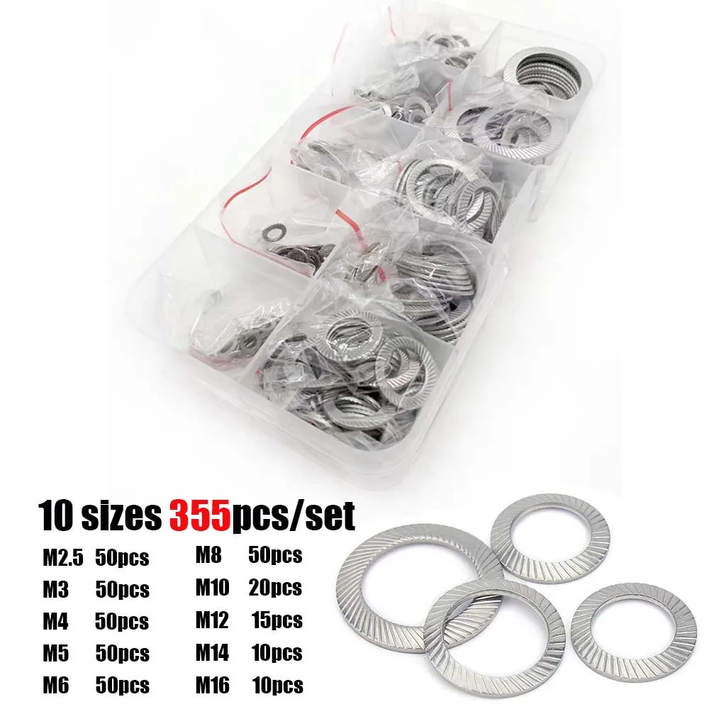 355pcs/set M2.5 to M16 DIN9250 304 Stainless Steel Knurled Elastic Gasket Disc Spring Serrated Lock Washer Assortment Kit Set