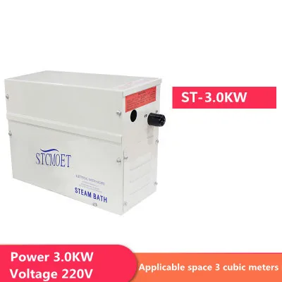 3KW Steam Generator Home Steam Machine Sauna Bath SPA Steam Shower 220V with Digital ControllerFunction:Life Cultivation and Health Care The steam generator through bodily movement,detoxifying sweat glands, drug fumigation can stimulate the human breathing system,skin open repair of the body&;s viscera regeneration, as a way to achieve the operate of health care Details:Product name:steam mechanical device Voltage:220V Power:3 Suit Area:≤3m³ Size: 395*145*395mm Water tank:stainless metal Main Material :Electrolytic plate with spray,stainless steel Function:Wet Steam Feature:Microcomputer electronic display leadership panel Control Panel:time and temperature set up The exhibit temperature is 25-55 degree, usually set 40-45 degree, linked with the placement of the temperature probe installed and the insulation affect of the roomDescription:This machine used overseas advanced technology, Meet the ergonomics design, used ST-135AD management panel, Digital exhibit Control with lamp. Realize the temperature environment of power of will within 35-55°C(95-131) range. Implementation time set automated shutdown time in 1-60 minutes. LED digital exhibit the temperature and the time, Lack of water automated self-protection function, The tank pressure safety defense function, Can control room lighting:Please remove the water point probe to take away limescale each month.