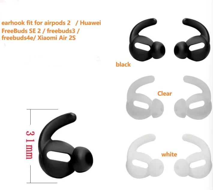positive earhook fit for airpods 2 / Huawei FreeBuds SE 2 / freebuds3 / freebuds4e/ Iconic Brand Air 2S Color:black,white,clear What you will get is 3pairs black,white,clear each pair