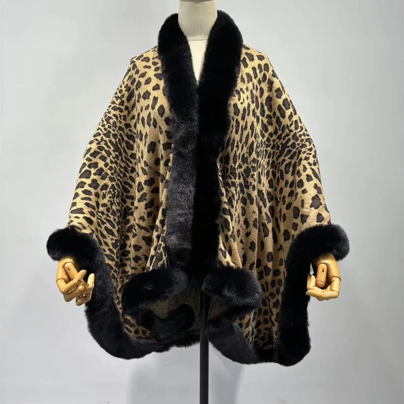 4 Colors Thick Cardigan Overcoat Winter Women Long Faux Fur Collar Leopard Dot Poncho Cape Loose Shawl Cloak Knitted Streetwear