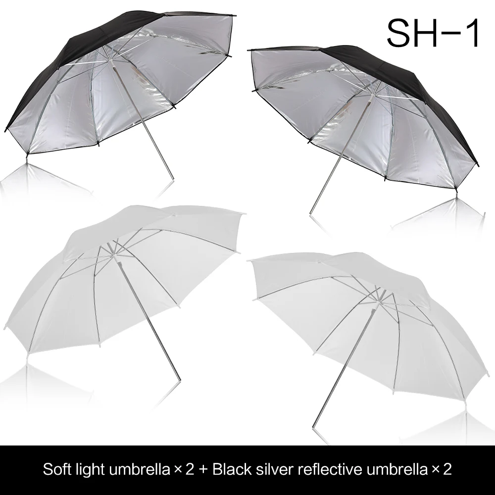 Description A--Translucent:The translucent umbrellas can be used both as a shoot via or bounce light to minimize shadows and produce an even, soft, low contrast mild over a comparatively huge field B--Sliver:The silver intrnal lining can lower light loss whereas maximizing gentle spread It permits about 50% transmission of sunshine to provide a side,even,and smooth illumination C--Black: Outer black lining retains unwanted light from being reflected into your photo D--Gold:The gold inside lining minimizes mild loss whereas maximizing light unfold permits about 50% transmission, present a wide, even and gentle illumination Package content SH-1 2*soft light umbrella + 2*black silver reflective umbrella SH-2 2*soft gentle umbrella + 2*black gold reflective umbrella SH-3 2*soft mild umbrella + 2*dual-use black silver umbrella SH-4 2*soft mild umbrella + 1*black gold reflective umbrella+1*black silver reflective umbrella SH-5 2*dual-use black silver umbrella + 1*black gold reflective umbrella+1*black silver reflective umbrella SH-6 1*soft light umbrella + 1*dual-use black silver umbrella + 1*black gold reflective umbrella+1*black silver reflective umbrella