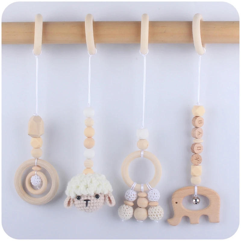 4Pcs/Set Baby Beech Hanging PendantsKnitting Doll Ring Teether Teething Nursing Rattle Toy for Stroller Gym Newborn Baby Shower