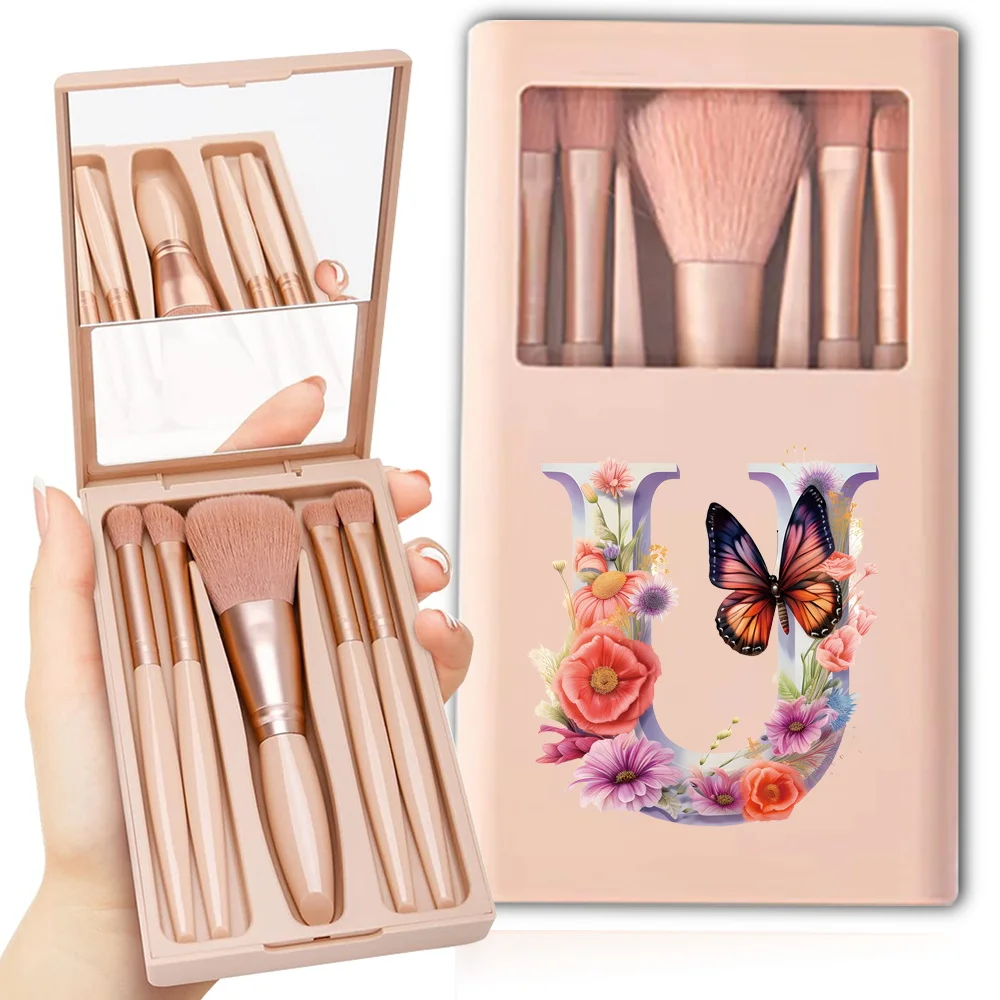 5 Pcs Makeup Brushes Kit Holder Box With Clear Mirror Soft Bristles Cosmetic Brush Set Protected Case Butterfly Letter Pattern