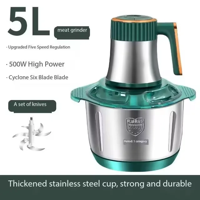 Features:1 steel compact body design, beautiful and easy to wash and operate. It has a sturdy metal-to-metal power snatch system. Stainless steel six blade and non-slip rubber pad4. Five pace strategies for a variety of varied ingredients, right for: meat, fruit, peanuts, walnuts, beans and so on. Specifications:Name: Electric meat grinderVoltage: 111-240VSpeed: 30,000-40000rpmMaterial: Stainless steel 304Gear: five gearsNoise: 36dBPower: 500WCapacity: 5LPlug:EU Plug,us plug,UK plug
