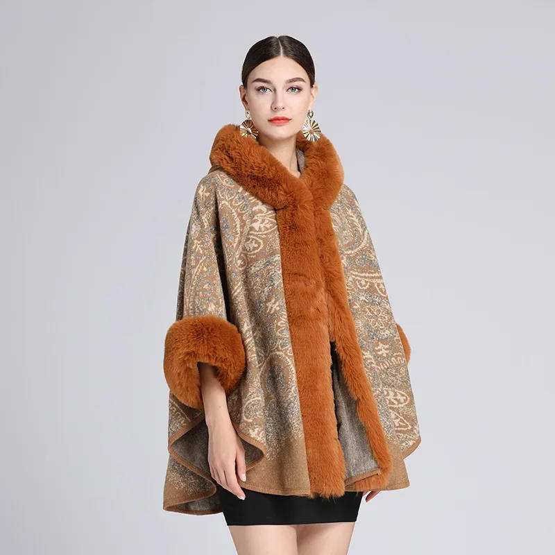 6 Colors Khaki Long Faux Rabbit Fur Collar Hat Cloak Women Party Overcoat Winter Thick Cape Loose Printed Streetwear Coat