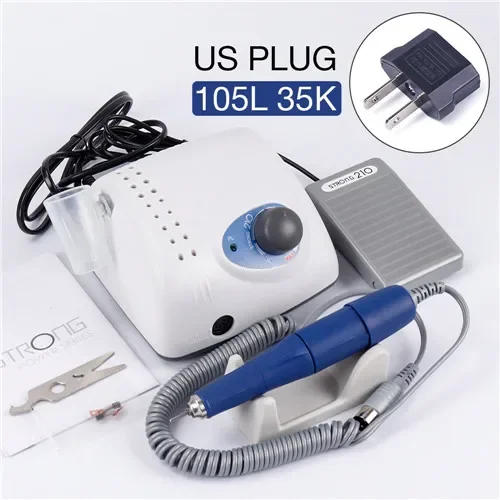 65W Strong 210 105L Nail Drills Manicure Pedicure Machine Electric Strong Nail File Polishing 35000RPM Nails Art Grinding Device Specification Item Type: Electric Manicure Drill & Accessory Material: Plastic+ABS Model: 210+105L Rotate Speed: 0-35000RPM Voltage: 110V/220V,50-60Hz Plug:EU Power:65W Output: DC 0-32V Color: As Picture Shown Handpiece weight:265g Main Machine Weight:1150g Main Machine Size: 13*12*8/5*4*3 Product Include 1*Main Machine 1* Handpiece 1*Foot Switch 1*Handpiece Support 1*Spare Carbon Brush 1*Wrench 1*User Manual(English) 1*Box Features 1 High Precision,Long Life Still regular even operating in high speed vibration and low noise 2 Drill Bits Holder 18*Drill Bits Holder 3 Foot Pedal No should press the ability switch elective foot pedal is integrated for the ability to strength the machine on or off for arms loose use 4 Potable Polisher : Equipped with speedy head-loading mechanism ,good locking positive , high velocity variations,and safety with low voltage machine 5 Power Box : Stable energy delivery,overload protection,effective converter,foot push, non-polarized velocity adjustment 6 Stable Functioning: The polishers produced are stable functioning, high velocity ,fast polishing , quipped with head lock 7 Multifunction: Combination of speedy changing polisher and multi-function energy box , Engraving, Routing, Grinding, Sharpening, Sanding, Polishing for Acrylic Nails,Gel Nails,Artificial Nails,Natural Nails,Pets&; Nails,not propose using for anything challenging 8 Application: Available for utilizing at nail salon,beauty parlor ,spa or own nail trimming pedicure,nail art,etc 9 Practical: TWIST-LOCK Forward/Reverse path swap appropriate for RIGHT HANDED or LEFT HANDED use, Foot pedal integrated Note 1 Please maintain equipment dry 2 Please verify the drill bit clip locked before using 3 Please give up using once you discover something strange or noise four Please substitute the speed gradually,don&;t regulate with significant modifications five Don&;t contact the elements in operating is risky 6 quit operating if you wish change the course of rotation 7 adjusting the speed, please be sure you install the drill bit first, otherwise the host may perhaps burn out, and you should purchase the host again