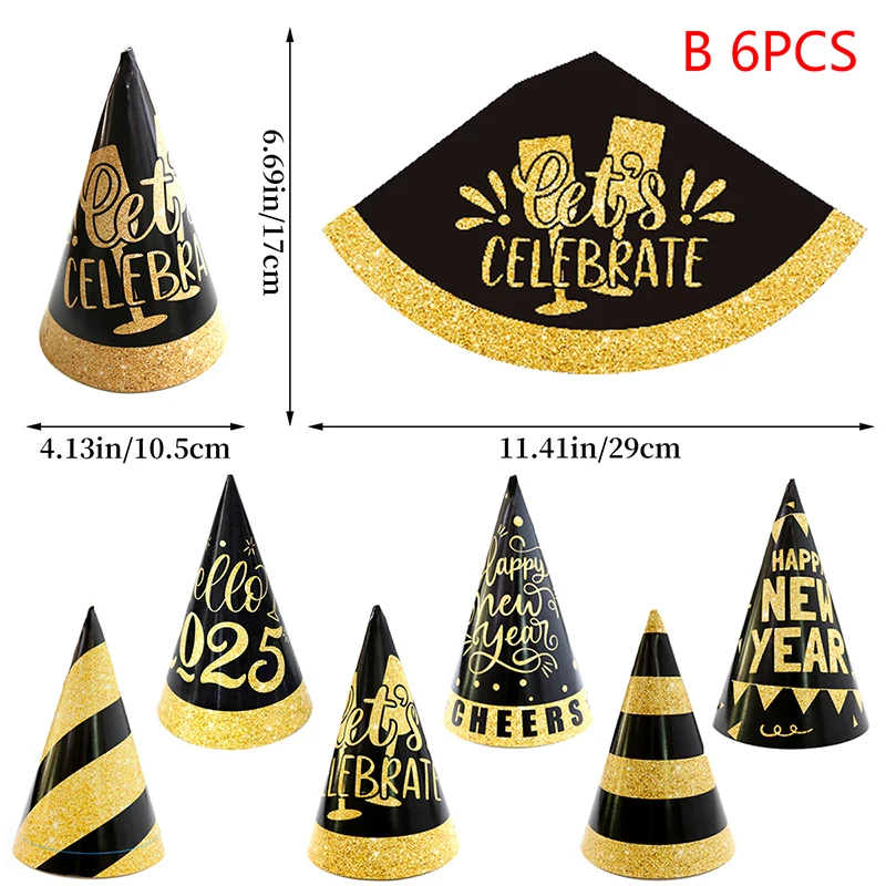 6pcs 3D Black Gold Happy New Year Paper Hat Cute 2025 New Year Paper Hat Frame Photo Props Party Decoration Holiday Gift