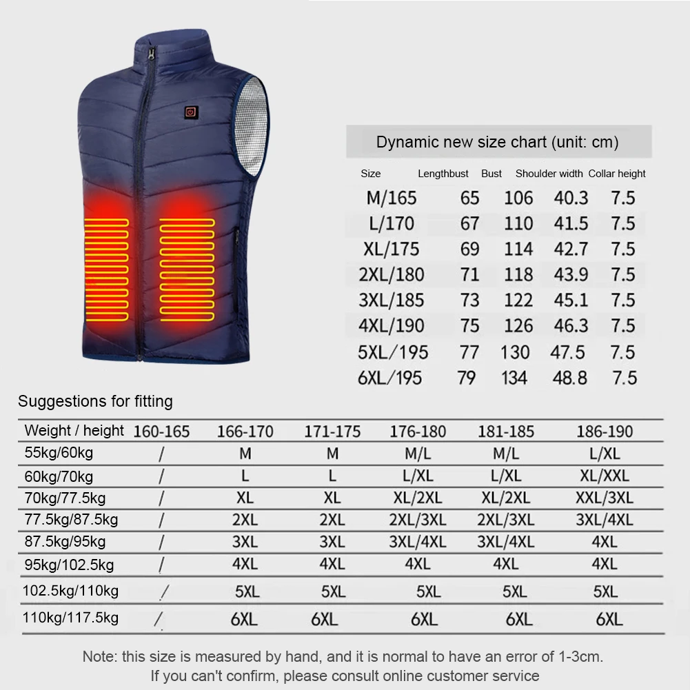 The United States prospects attention: When you select "Ship From United States", the ensuing addresses won't present shipping service: Hawaii, Alaska, Puerto Rico, Guam, APO, DPO, FPO, and so forth Recommend you to make a decision "Ship From China" you!!! Clientes de España atención: Cuando selecciona "Enviar desde España", el servicio de entrega no está disponible en los siguientes códigos postales: 35000-35999 38000-38999 Se recomienda que elija "Enviar desde China" ¡Gracias! ! ! Winter Heating Vest Jackets 9 Areas Electric Thermal Waistcoat Men Women USB Body Warmer Coat for Outdoor Hiking Camping Fishing Skiing Plus Size 6XL Feature: 1 9 Heating Zones: Humanized heating part design,a heating block is designed for the neck and back elements that are smooth to get cold, and a large-capacity zipper pocket prevents items from being misplaced 2 Safe and lightweight: the upgraded heating system can make sure you to take pleasure in happy warmth Large area carbon fiber cord heater is secure and insulated & skin-friendly, touching smoothly and heat larger It allow you to spend the whole winter smoothly without sporting huge clothing in bloodless conditions 3 USB Charging: Easy to price You should always join 5V cellular strength (this product would not encompass cellular power) 4 Large-area Heating: The electric heating vest has Many built-in heaters, which have a blood stream and heat function, which not only warms your stomach, back, waist and abdomen,but also promotes blood move five Wide range of applications: This heated vest is good for outdoor skiing,winter fishing, mountain biking, cycling, camping, snow hiking, hunting,outdoor attendance, winter street, daily office, etc Specification: Origin: Mainland China Size: M, L, XL, 2XL, 3XL, 4XL, 5XL, 6XL(Optional) Blue, blue, camouflage(optional) Gender: Men & Women Feature: Thermal Model Number: Heated Jacket Fabric: polyester Voltage: 5V Power supply: battery(not included) Long endurance (taking ten thousand mA power bank as an example) 10000 mA = 6 hours Warm tip: This product should be linked with a mobile strength supply when it heats up, and it will robotically give up heating after being unplugged Note: Due to the various monitor and light-weight effect, the actual shade of the item might be slightly varied from the color showed on the photographs Thank you! Please allow 1-2cm measuring deviation due to guide measurement 1 x Heating Vest