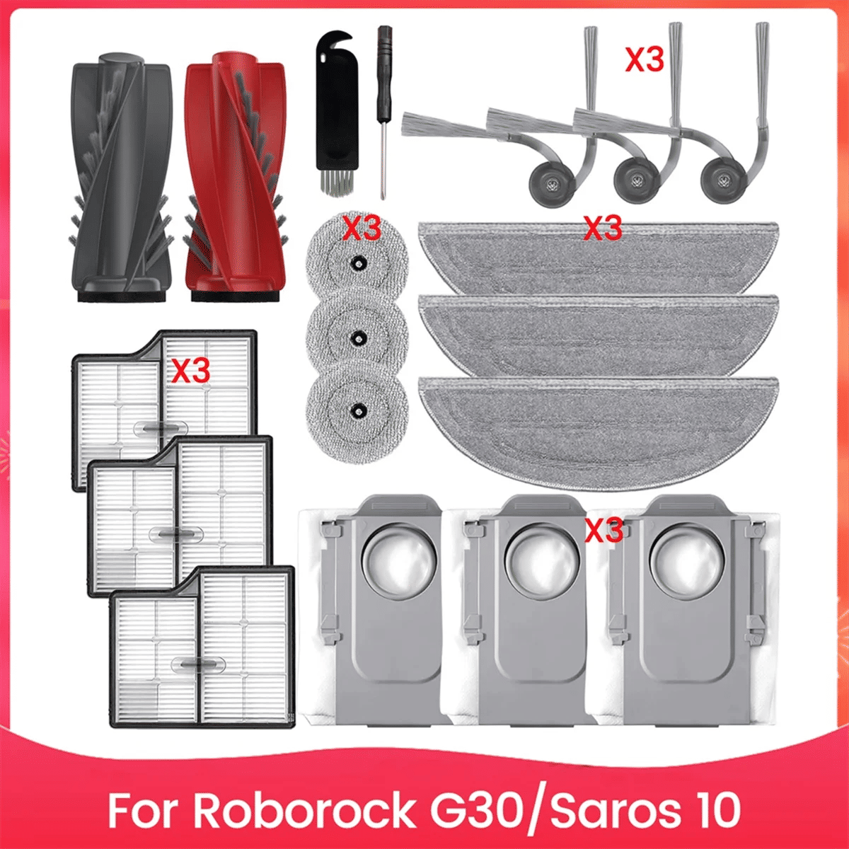 Practicality: Designed specifically for Roborock Saros 10 Robot Vacuum, ensuring a perfect fit and optimum performance Please confirm your mannequin earlier than shopping Dual Main Brushes: Featuring a distinct twin brush formulation with one crimson and one gray roller, this design complements particles pick-up on a wide range of surface forms from hardwood to carpet, ensuring thorough cleansing without destructive surfaces HEPA Filtration System: Equipped with a high-performance HEPA filter, our package efficiently captures superb debris and dust This not just maintains optimum suction strength on your vacuum cleaner, but in addition creates a healthier indoor surroundings through lowering airborne allergens Enhanced Cleaning Accessories: The aspect brushes are designed to reach into corners and edges for a more comprehensive clean, while the washer-friendly mop material affords an eco-friendly technique to keep your flooring spotless The included filth bag features a secure closure method to simplify crumb disposal and cut spillage Function: Consumables Use environment: Home use Colour:As Shown Material:plastic+cloth Package Contents: 1 * leading brushes three * facet brushes 3 * mop cloths three * filters 3 * filth baggage 1 * Cleaning brush 1 * Screwdriver Only the above equipment content, different merchandise aren't included Note: Light mirrored image and various reveals could cause the color of the object within the picture a little varied from the genuine factor The measurement allowed error is +/- 1-3cm