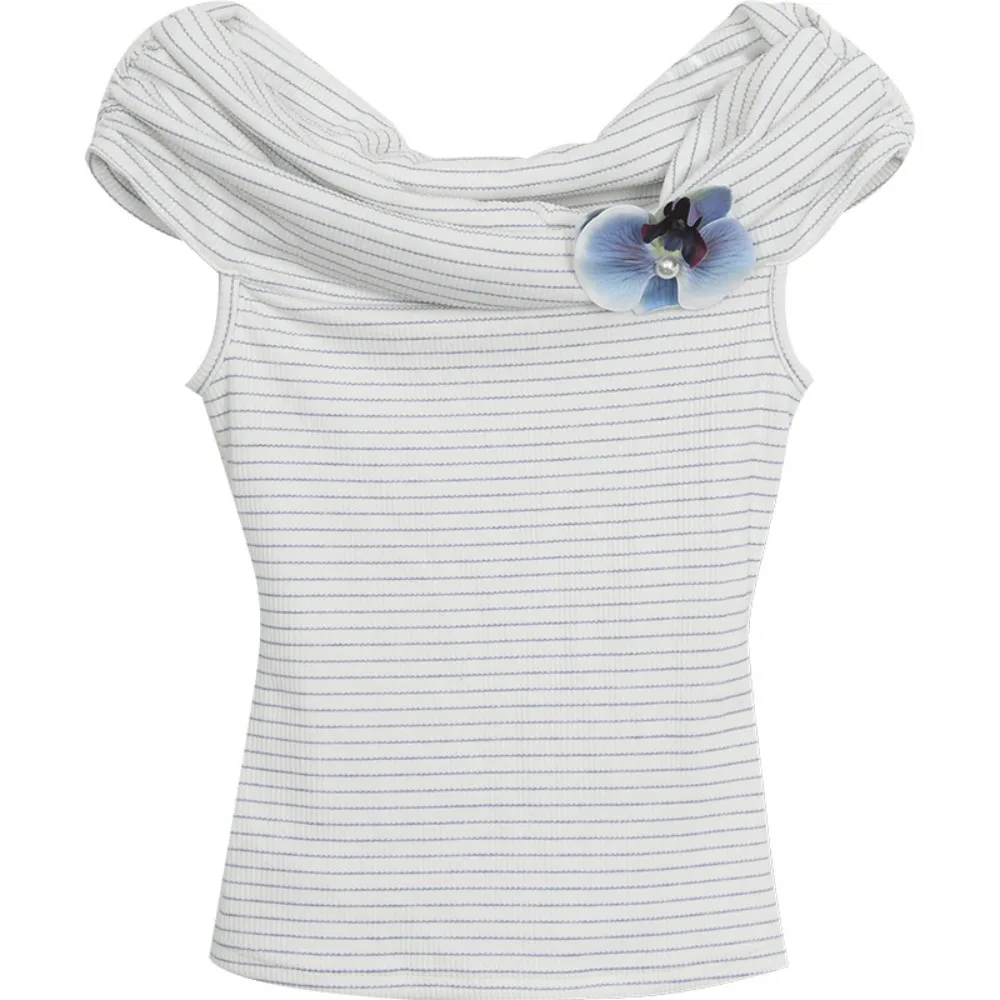 All-match Stripe Off Shoulder Crop Top Slim Fit Ins Bohemia T Shirts Sweet Female Clothing Stripe Flower T-shirt Female