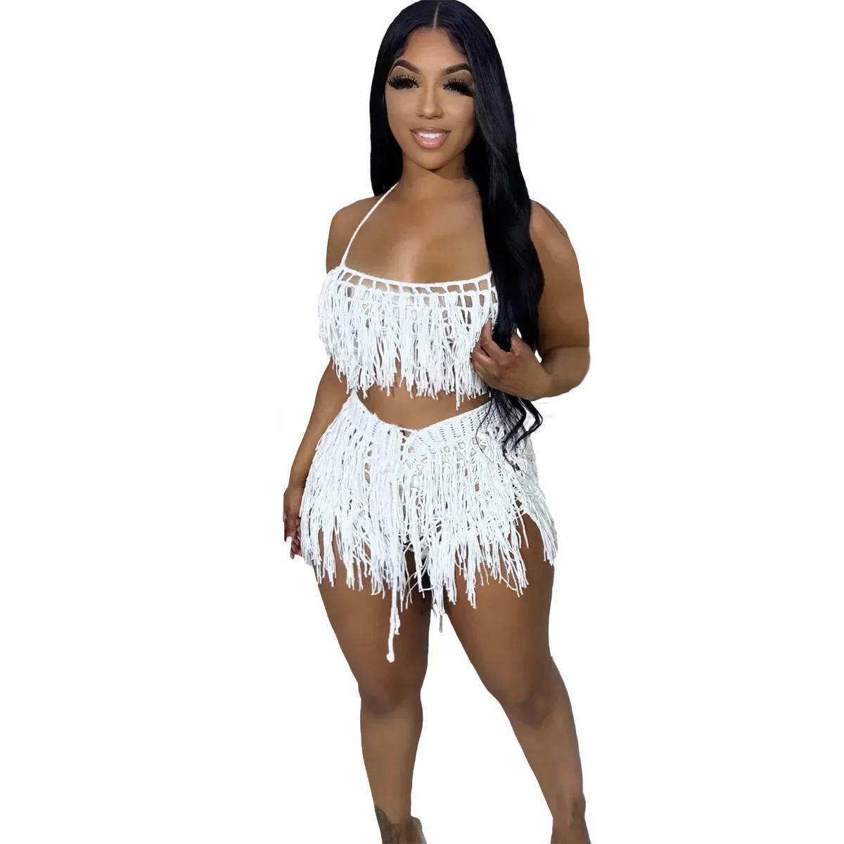 ANJAMANOR Sexy See Through Knit Crochet Fringed Short Sets Beach Vacation Summer Outfits for Women 2023 Two Piece Set D0-DG25