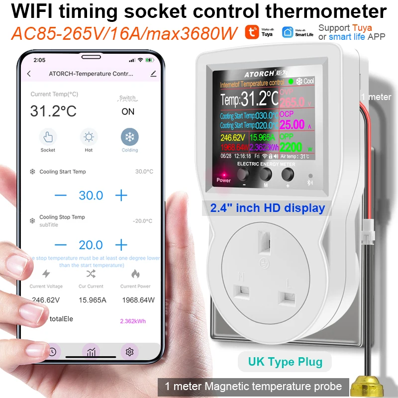 Aubess S1 WIFI Smart Thermostat Socket Incubator Temperature Controller Outlet With Timer Switch 16A AC220V For Heating Cooling Tips: Current range: 3 holes 16A/5 holes 10A User Manual and Software Download 1 Manual download: 2 download: Search in google play or apple app store: "tuya" or "smart life" app Warning: In order to unnecessary disputes, the consequent nations Please choose FR specification France, Belgium, Slovakia, Czech Republic, Poland S1 Temperature and humidity controller - Display Panel: 2 inches TFT-LCD HD Display Panel Graphic 240X320 RGB Dot-matrix A temperature control software that could be remotely managed by way of a cellphone (No subject the place you are,You can management the device remotely by way of your cellular phone!) In order to welcome the Internet of Everything (IoT) era, Juwei technology engineers have labored worrying for a number of days, after many hardware edition experiments, code upgrades and interface optimization, to create an easy-to-use, easy-to-use and applicable ATorch Power Socket that meets the expectancies of practically all of users. One task would be willing at home. The equipment can realize distant measurement and management at the Internet, distant voltage and latest electrical energy bill dimension on cellular phones, distant question of cloud electrical energy monthly dossier and annual report, intelligent AI voice control, several programming control, overvoltage and overcurrent Power automated power-off security control, and high-definition shade screen show different contents, such as detection of latest voltage, current, power, electricity, frequency, strength element measurement data, community demonstrate of air high quality index, PM2 concentration, today's temperature today, humidity, and calendar time and week The information vital for life, mixed with packages akin to clever charging and power-off, can also notice secure charging and power saving, etc., plus the WiFi version of the power bank remote unfastened firmware upgrade function, to achieve an entire life unfastened replace service for one purchase. Features of S1 WIFI: 1 Control:Connect the S1 Wi-Fi Temperature controller to 2 Wi-Fi, then you definitely can display screen or adjust the Temperature on your phone through the app at any time anywhere. 2 Relay Same Output:Support one equipment. Auto,ON,OFF Voltage: 85-265VAC 50/60Hz, Current:10A. Maximum 16A Power: 1200W(120VAC), 2200W(220VAC). MAX Power:3680W(230VAC) Humidity size range: 1 ~ 99% RH. Temperature measurement range: -20 ~ 120°C Plug-n-Play:No confusing installation required. Display the set temperature cost and the measured temperature cost at the same time with 2" inch immoderate screens. Support Temperature calibration: Support Tuya and intelligent lifestyles app Support °C or °F temperature unit environment swap Notes: 1 magnetic probe and temperature Do now not put probes or steel twine into fire. 2 magnetic probe probe Do now not put probes into water, it would end in inaccurate measurements. 3 support2 Wi-Fi(Support IEEE 802/g/n). four Connection: Wi-Fi Connection for iOS⩓roid(Tuya or Smart Life APP) Protective operate Over-voltage automatic power-off protection, Over-current automatic power-off protection, Over-power automated power-off protection, Long press the " " button to go into another operate examine interface For more gameplay, please see the specific introduction! Three working modes 1 interface (ON/OFF) 2. Heating mode control 3. Cooling mode control Notes:This interface is within the mobile APP mode. Remote control APP (smart existence APP or Tuya APP) pairing network operation method! Please search for "smart life" or "Tuya" app in Google Play or Apple Store A type of high-definition color exhibit designs 2 high-definition coloration English display WiFi network configuration and advent APP Timing ambiance and timing temperature environment Timer substitute ON/OFF: In this mode, you'd persist with the stairs beneath to set the timer substitute function to expose off or activate the machine in a distinct period of time 1 function is similar to a remote change and in addition a timing exchange
