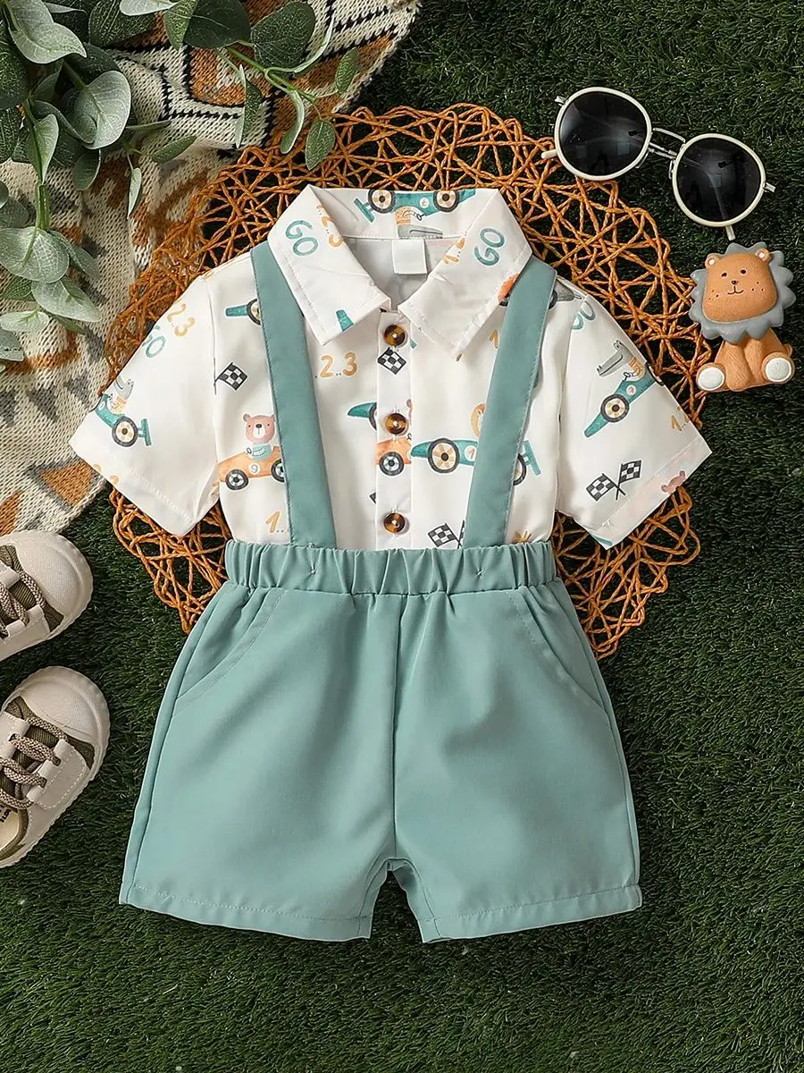 Baby Boys Kids 2pcs Turn-down Collar Cartoon short sleeved T-shirt and Overalls Sets