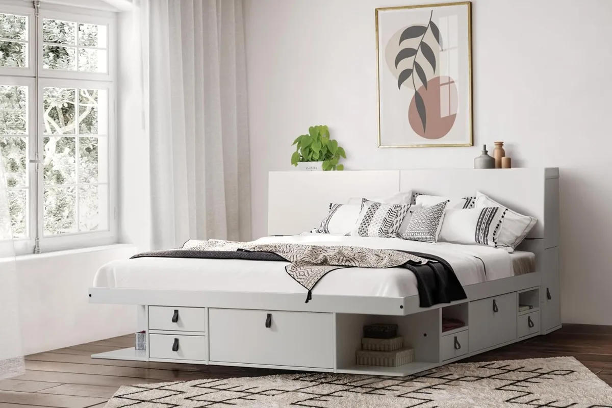 Bali Storage Set Platform Bed with Drawers + Storage Headboard (King Size White Wood) PLENTY OF STORAGE SPACE