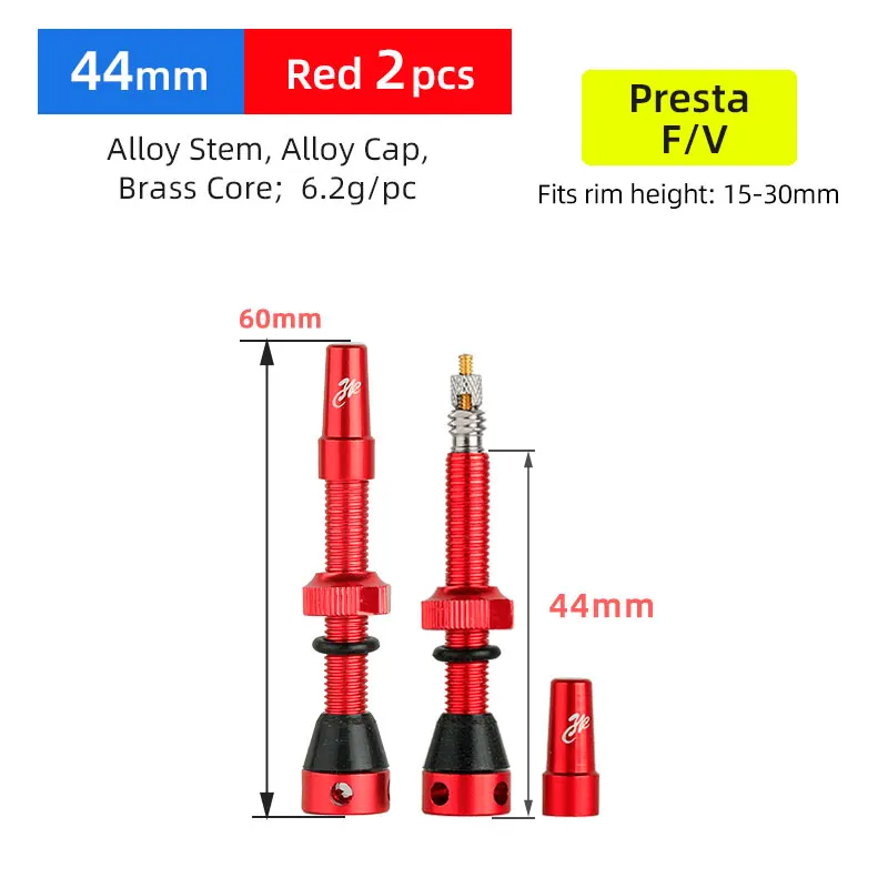 Features: - Well-made Presta valve nozzle to fit bike rim profiles; - Removable brass core, clean addition of tubeless sealant; - Rubber base suits most mountain motorbike and road rim profiles; - Nuts trimmed for useful & firm install; - With Hex slot on the bottom for firm mount; - Comes with alloy threaded cap and gear Specifications: - Valve Type: Presta F/V - Inserts: Mainly brass, nickel plated; Removable - Stem: Aluminum alloy, anodized; Trimmed - Nuts: Aluminum alloy, anodized; Trimmed - Arched washers: Plastic; 2 forms incl - Height: 44mm (For Rim Depth 15-30mm) 60mm (For Rim Depth 30-45mm ) 80mm (For Rim Depth 45-65mm ) - Weight: 12gr/pr (44mm), 14gr /pair (60mm),16gr /pair (80mm)