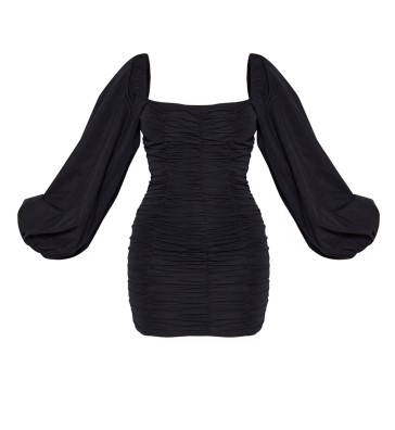 Black Balloon Sleeve Ruched Bodycon Dress