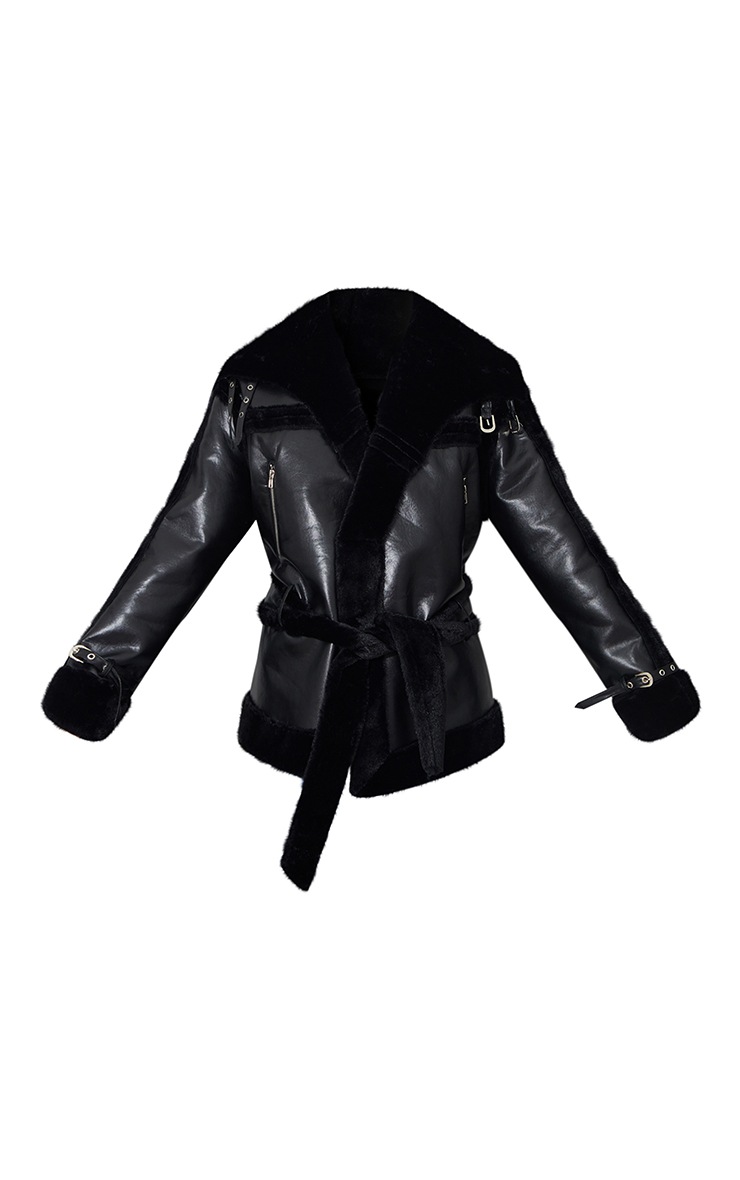 Black Faux Fur Trim Belted Zip Detail Jacket