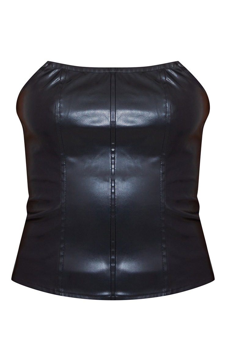 The spotlight is sure to be shining your way this season with this top. Featuring a black faux leather material with a corset design and a flattering fit, we are obsessed. Wear with black bottoms and heels for a statement finish that will have all eyes looking your way. Length approx 30.5cm/12" (Based on a sample size UK 8) Model wears size UK 8/ EU 36/ AUS 8/ US 4 Model Height - 5ft 8"