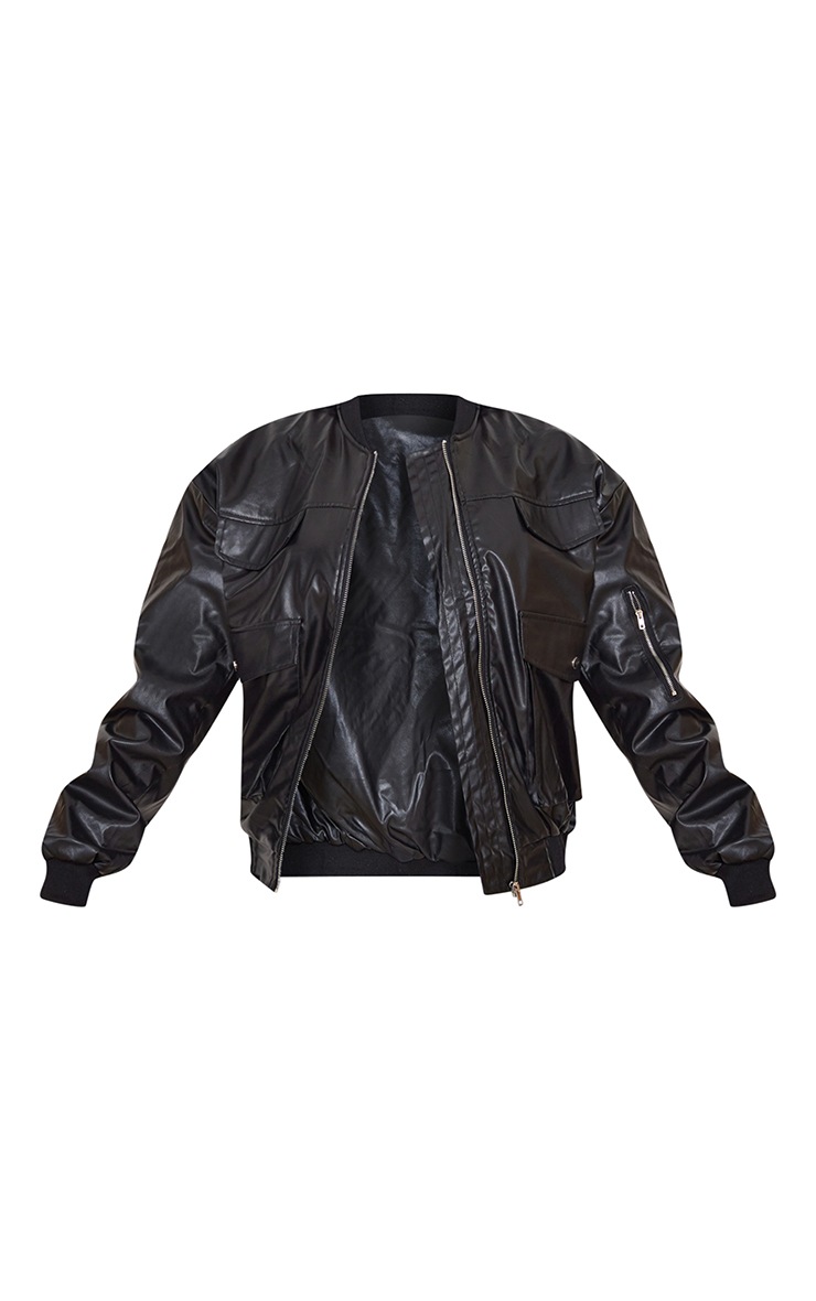 Switch up your signature style with this bomber jacket. Featuring a black faux leather material with an oversized fit and pocket detail, wear with oversized baggy pieces for a look we are loving. Length approx 63.5cm/25" (Based on a sample size UK 8) Model wears size UK 8/ EU 36/ AUS 8/ US 4 Model Height - 5ft 6.5" Model Height - 5ft 7"