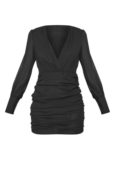 Black Long Sleeve Chiffon Ruched Bodycon Dress