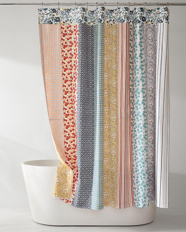 Inspired by our Camille Quilt, this vibrant shower curtain always looks on the bright side. Made from soft cotton, it reverses from stripes to floral print for two playful looks in one. Reversible Two-ply; attached at top for free-flowing ease Adds a playful pop of color and pattern to any bathroom One side features an eclectic mix of palampore, florals, geometrics, and stripes; yellow palampore print on the flip side Buttonholes at the top for easy hanging Hemmed edges Liner is sold separately