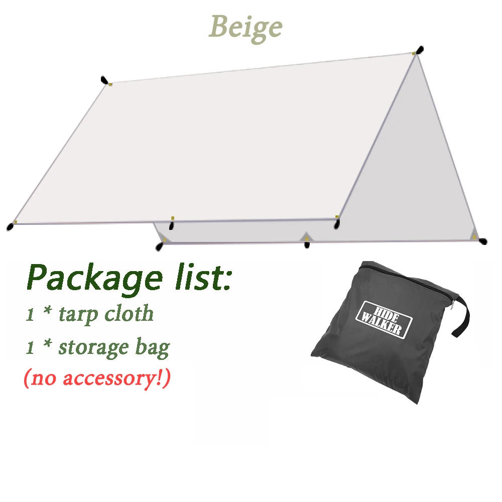 Recommend select "Buydo Standard Shipping" to convey your parcels It is relatively have larger quality and faster to most nation Description This tarp is awfully large, the largest hide discipline is 9~15 square meters Polyester cloth fabric, with silver lined on again Anti UV craft, blockading greater than 90% of the ultraviolet rays; Waterproof fabric,waterproof index 2000mm be as easily tent, as a wind proof and rain evidence tent, camping tent for outside journey Specification Brand: HIDE WALKER Surface Fabric: 210T Polyester cloth(PU 2000mm) + Silver Coating (UV50 +) Expanded size & Weight: 3*3m approximate 730g 3*4m approximate 950g 3*5m approximate 1250g Both gentle and transportable Characteristics: 1, small packaging volume, vast developed area; 2, portable, smooth to use; 3, rain proof, anti ultraviolet; 4, appropriate for color in summer, the park rest, picnics, windproof cold insulation, open air party, booth decoration and many others use; 5, Can be a canopy to the tent surface, lower the noise attributable to raindrops falling on the peak of the tent,makes you've a reputable napping 6,As a picnic mat use Package Including: 1 X Tarp Cloth 1 X Carriage Bag (grey or green) *The accessories in the photo are for show applications solely The pegs, ropes, and assist poles have to be purchased separately Size: Color: The white here is now not natural white, some customer name it rice white/ ivory white/beige/off-white The again is coated with silver to efficiently block daylight and ultraviolet rays the same time, the waterproof performance of the material is stepped forward More details: Sophisticated craftsmanship Waterproof functionality display: 2000mm waterproof, can forestall heavy rain (This is a close-up shot of white cloth You can see that it is not pure white, it's rice white/ivory white/beige The benefit of rice white is more proof against dirt than natural white) Build steps: Accessories like ropes,poles,pegs ect for scenes show only, must be purchased separately to go to accessory pages in this shop Rice White: This white tarp isn't always natural white, but rice white/ivory white/beige/off-white This coloration is more filth resistant than natural white, and has greater visual effect and sunscreen impact Due to the stable gentle when shooting outdoors, the photographs will appear whiter Indoor capturing effect can look the water resistant effect photo above This colour is the most well liked in China Black: The black tarp appears to be like calm and atmospheric, and its shading impact also is the finest It is particularly appropriate for places with solid sunlight In terms of color, it really works well with hardline off-road vehicles, pickups, machinery, and many others This coloration is the hottest in Thailand Green: The inexperienced tarp presents people the sensation of being near to nature It is appropriate for out of doors fanatics to camp and discover This coloration is the hottest in Russia Khaki: Khaki has a warm feeling It is appropriate for couples to play on the seaside, kin picnic, park leisure, outdoor images set and other scenes With light coloured tables and chairs, baskets and picnic mats, the impact is very good This colour is the most well liked in South Korea, Malaysia,Spain,China Some photographs from our users: If you've got taken any exquisite outdoor photo of our tarp, you're welcome to publish it in the suggestions wit 5 stars to let consumers from all over the world to enjoy it together~ Warm tips: 1,Some accessories in the picture are just used as taking pictures props, please pay attention to the record of programs we listed in the beginning If you like those accessories, please go to the equipment page of our shop to buy them 2,Please do not depart your little one play alone and unattended are recommended to use below grownup supervision Note: * The actual shade may perhaps range slightly from the web picture thanks to monitor coloration settings,not a product defect, please perceive * Please allow slight size deviation for the information *If you desire to know more details or have any questions, please leaf through the detailed web page or contact the customer service