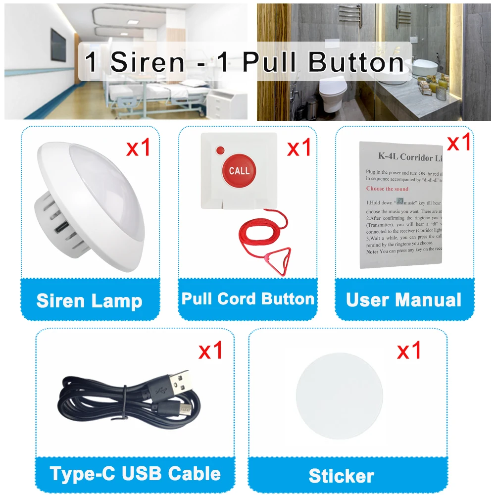 Caregiver Pager Panic Button SOS Wireless Nurse Call Siren Alarm Buzzer System for Elderly Disabled Seniors Toliet Bathroom Hospital Packing included: SET 1: 1 * Siren Receiver 1 * Pull Cord Button for Disabled Bathroom Toliet 1 * Type-C Charging Cable 1 * User Manual 1 * Sticker ------------------- SET 2: 1 * Siren Receiver 2 * Pull Cord Button for Disabled Bathroom Toliet 1 * Type-C Charging Cable 1 * User Manual 2 * Sticker Feature: 1 Quick Calling: When there is emergency, simply push the decision button, and the alert message will immediately send to the receiver 2 Stable Signal: The working range can arise to 50-100 meters in an open area, making sure that you'll never loss a decision in evening three Alerting Mode: Has 5 pieces song and 4 point quantity adjustment, also permits free matching between transmitter and receiver 4 Extensive Use: Can be broadly utilized in home, nursing home, health center and so on, fits perfectly for the elderly, patient, etc 5 Easy Carrying: Comes with a lightweight weight and a compact size as well, perfect for either indoor and outdoor, safeguarding the safety K-4L Wireless Caregiver Lamp Receiver: 1 With 3 color: Red, Blue, Green 2 Different color for different carrier kind three It can paintings with 30 transmitter in max four With separate output power supply: DC5V five inside with 700mah battery five The prompting sound could be became on/off 6 Dimension: 90*90*52mm K-CALL-RR-P Patient Nurse SOS Call Button Transmitter : 1 Waterproof 2 3 key: Pull cord button to Calling, Call, Cancel 3 Signal Distance: around 150-200M in open field 4 Material: PC five Dimension: 8*8*1cm 6 Wall-mounted installation 7 With 12V 23A battery eight Opener to alter the battery smoothly