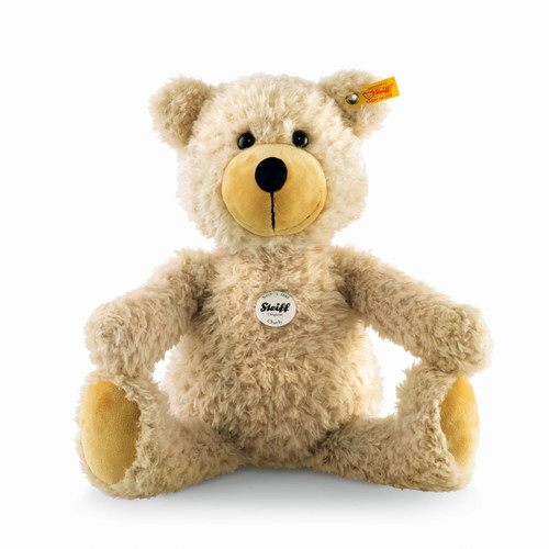Product Details: Material: Made of cuddly soft plush Size: 16 inches Color: Beige Eyes: Safety eyes Ear Tag: Yellow tag with brass-plated "Button in Ear" Joints: Not jointed Pose: None Sound Device: None Care: Machine washable at 86°F (30°C); Country of Origin: Made in Tunisia