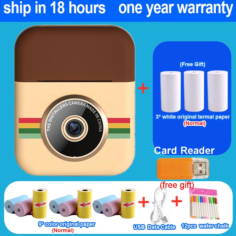 Kids Children Instant Digital Print Camera With Thermal Photo Paper Toys Camera 1080P 2.4in For Christmas Birthday Gift Girl Boy Specifications: Item name :Kids Instant Camera Product function:Take Photo ,Print,Video recording Printing method:Grayscale printing technology(no ink required) Display effect: Black and White Imaging /200PDI Product PX:4000*3000px Battery Power: 1500mAh Display Screen: 2.4 Inch IPS eye protection screen Image Resolution: 12MP Video Resolution: FHD(1920*1080px)/HD(1280*720px) Charging time: 1.5-2 hours Support TF card: Up to 32GB (option) Main Functions: 1. Switch filters 2.Take photo & print photo 3.Photo album 4.Switch filters 5. Shutter/ long press to record 6.Before switching / long press to shut down. 7.Press once to set/ press twice to return Packing List: Instant Print Camera * 1 USB Data Cable * 1 TF Card * 1 (8GB/32GB,up to your choice) Thermal Paper *3 rolls Manual * 1 Detailed Pictures: